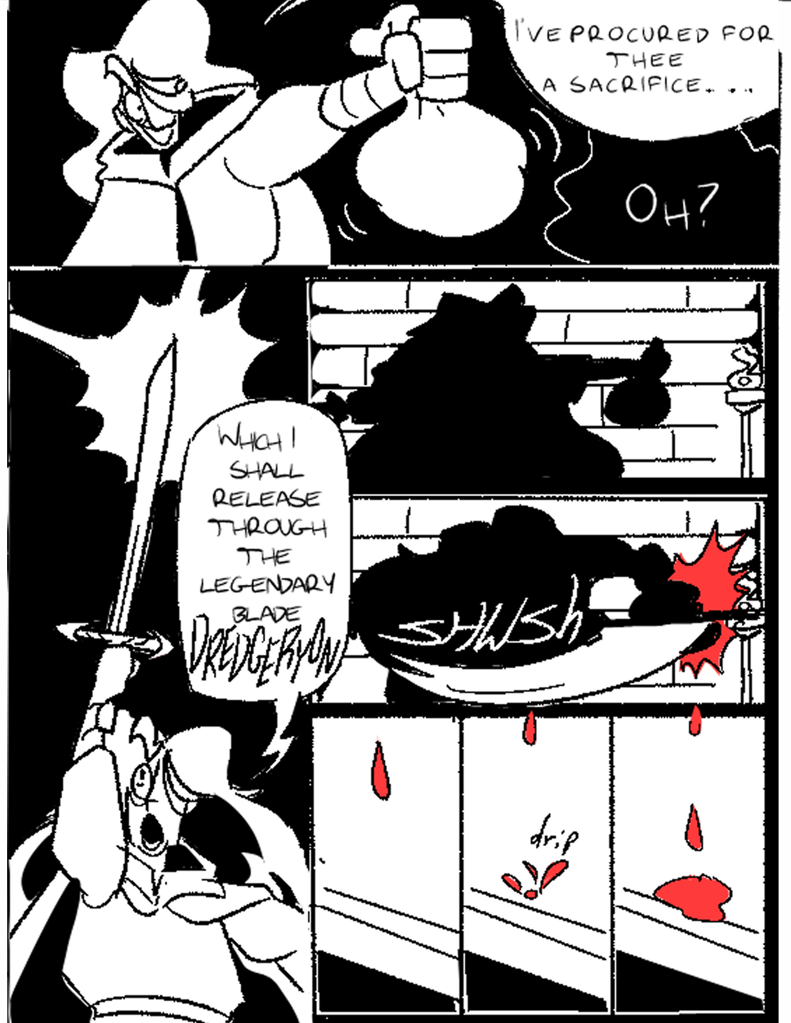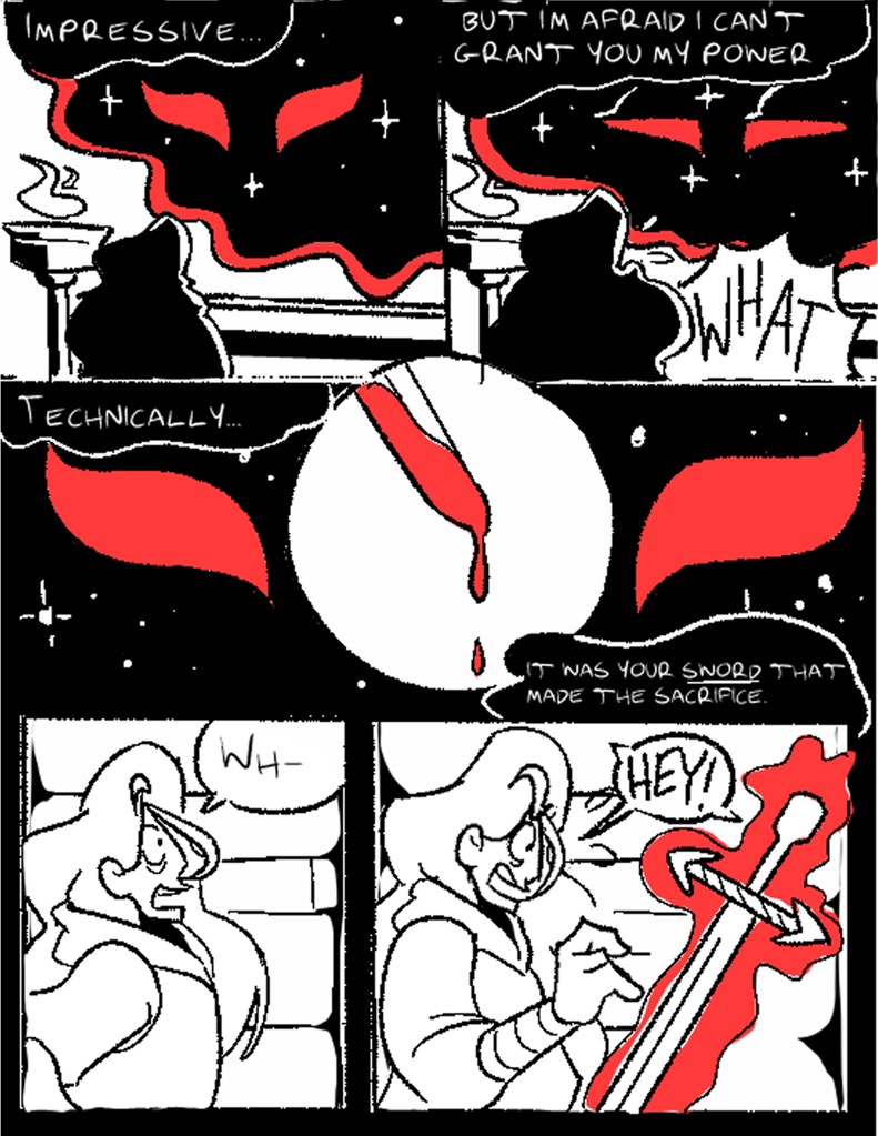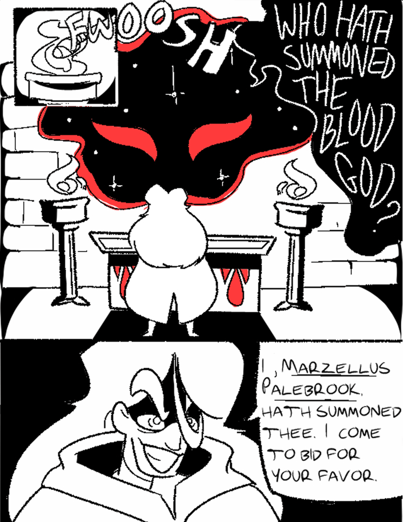 Aspiring warlock Marzellus Palebrook seeks to make a deal with the Blood God for untold power. The Blood God in question turns out to be very literal about who is actually responsible for carrying out the requisite blood sacrifice, which is excellent news…for Marzellus’s sword.