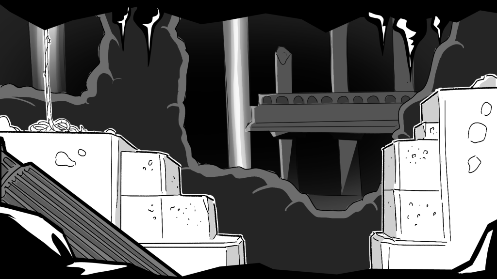 The Claws of Fate is my first boarding project to have clean, greyscale backgrounds for many of its shots, inspired by the pixel art setpieces in the indie game Shovel Knight. The pieces below are four of those, used in the opening shot of the final cut.